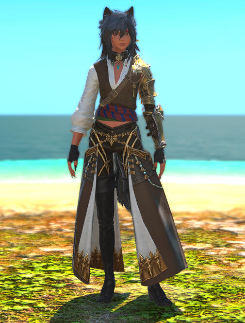 Tail Fluffy medium length tail the same color as his hair.Shirt Layered brown vest on top of a white shirt with an armored left arm and muti-colored sash around his waist.Pants Black pants with an attached, decorated brown skirt.Gloves Half-gloves /handwraps in blackBoots Long thighboots that are slightly rolled down at the top and have a 2 inch heel.